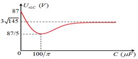Cho mạch điện RLC không phân nhánh, cuộn dây có điện trở r. Đặt vào hai đầu đoạn mạch một điện áp xoay chiều có tần số f = 50Hz. Cho điện dung C thay đổi người ta thu được đồ thị liên hệ giữa điện áp hai đầu phần mạch chứa cuộn dây và tụ điện như hình vẽ bên. Điện trở r có giá trị là